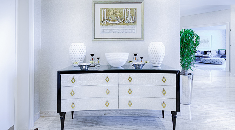 Palazzo Versace is recognizable for its contemporary and glamorous traits; which I translated in the choice of the materials. The apartment offers an incredible view on Dubai skyline which I played with by carefully planning the use of sheers, curtains and mirrors.